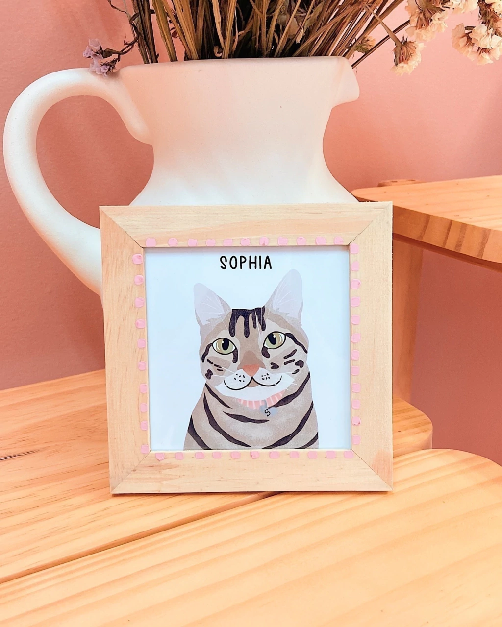 Após realizar sua compra, entre em contato conosco pelo WhatsApp informando o número do seu pedido com as seguintes informações: foto do pet que servirá de base para a arte + cor escolhida para os detalhes na moldura.